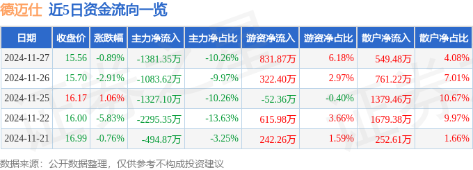 截至2024年11月27日收盘,德迈仕(301007)报收于15.56元,下跌0.89%,换手率5.86%,成交量8.8万手,成交额1.35亿元。