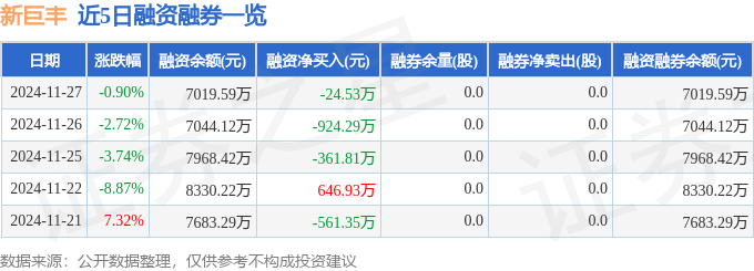新巨丰融资融券信息显示,融资方面,当日融资买入345.7万元,融资偿还370.23万元,融资净偿还24.53万元。融券方面,融券卖出0.0股,融券偿还0.0股,融券余量0.0股,融券余额0.0万元。融资融券余额7019.59万元。
