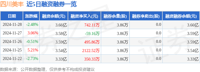 四川美丰融资融券信息显示,融资方面,当日融资买入3295.96万元,融资偿还2553.85万元,融资净买入742.11万元。融券方面,融券卖出0.0股,融券偿还0.0股,融券余量3.86万股,融券余额30.42万元。融资融券余额3.66亿元。