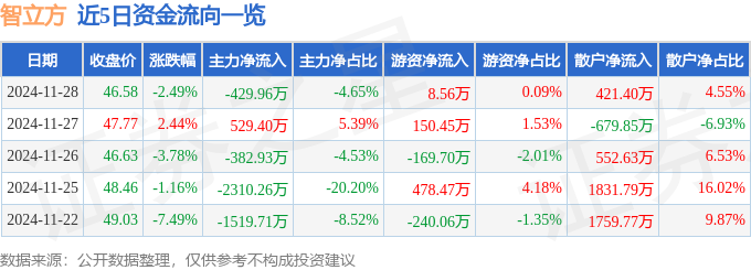 截至2024年11月28日收盘,智立方(301312)报收于46.58元,下跌2.49%,换手率7.61%,成交量1.96万手,成交额9255.63万元。