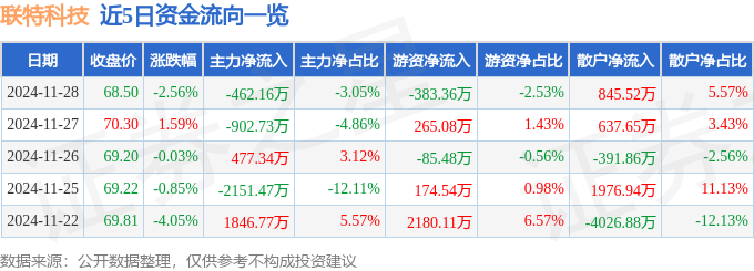 截至2024年11月28日收盘,联特科技(301205)报收于68.5元,下跌2.56%,换手率3.22%,成交量2.19万手,成交额1.52亿元。