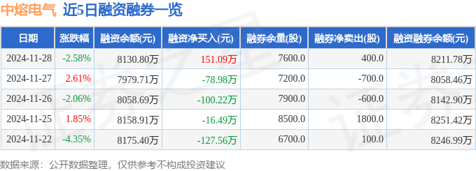 中熔电气融资融券信息显示,融资方面,当日融资买入560.66万元,融资偿还409.57万元,融资净买入151.09万元。融券方面,融券卖出400.0股,融券偿还0.0股,融券余量7600.0股,融券余额80.99万元。融资融券余额8211.78万元。