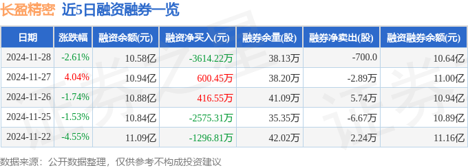截至2024年11月28日收盘,长盈精密(300115)报收于16.05元,下跌2.61%,换手率3.38%,成交量40.63万手,成交额6.61亿元。