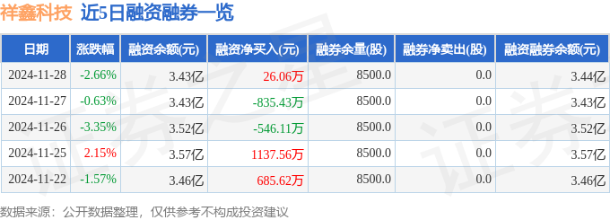 祥鑫科技融资融券信息显示,融资方面,当日融资买入1866.76万元,融资偿还1840.7万元,融资净买入26.06万元。融券方面,融券卖出0.0股,融券偿还0.0股,融券余量8500.0股,融券余额24.92万元。融资融券余额3.44亿元。