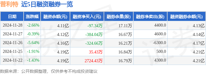 普利特融资融券信息显示,融资方面,当日融资买入2188.91万元,融资偿还2286.24万元,融资净偿还97.34万元。融券方面,融券卖出4500.0股,融券偿还100.0股,融券余量17.11万股,融券余额169.22万元。融资融券余额4.13亿元。