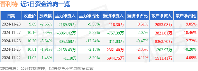 11月28日的资金流向数据方面,主力资金净流出2169.39万元,占总成交额9.56%,游资资金净流入116.3万元,占总成交额0.51%,散户资金净流入2053.08万元,占总成交额9.05%。
