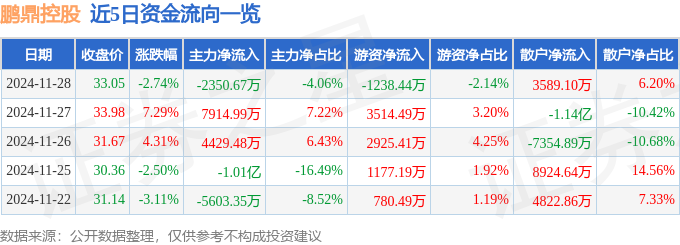 截至2024年11月28日收盘,鹏鼎控股(002938)报收于33.05元,下跌2.74%,换手率0.75%,成交量17.39万手,成交额5.78亿元。