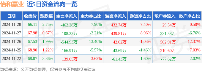 截至2024年11月28日收盘,怡和嘉业(301367)报收于66.11元,下跌2.75%,换手率1.55%,成交量8776.0手,成交额5850.49万元。