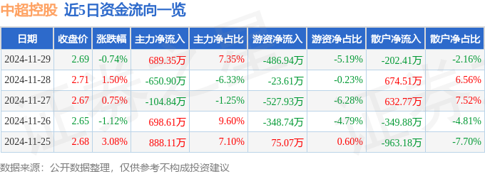 11月29日的资金流向数据方面,主力资金净流入689.35万元,占总成交额7.35%,游资资金净流出486.94万元,占总成交额5.19%,散户资金净流出202.41万元,占总成交额2.16%。