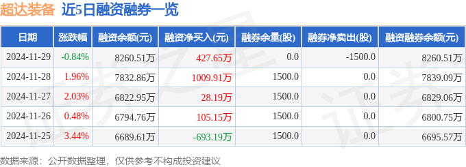超达装备融资融券信息显示,融资方面,当日融资买入1588.25万元,融资偿还1160.6万元,融资净买入427.65万元,连续3日净买入累计1465.75万元。融券方面,融券卖出0.0股,融券偿还1500.0股,融券余量0.0股,融券余额0.0万元。融资融券余额8260.51万元。
