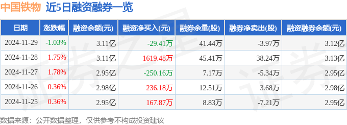 中国铁物融资融券信息显示,融资方面,当日融资买入4637.17万元,融资偿还4666.58万元,融资净偿还29.41万元。融券方面,融券卖出200.0股,融券偿还3.99万股,融券余量41.44万股,融券余额119.35万元。融资融券余额3.12亿元。