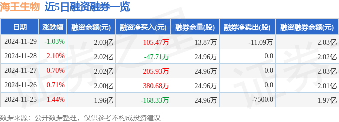 海王生物融资融券信息显示,融资方面,当日融资买入729.01万元,融资偿还623.55万元,融资净买入105.47万元。融券方面,融券卖出0.0股,融券偿还11.09万股,融券余量13.87万股,融券余额40.08万元。融资融券余额2.03亿元。