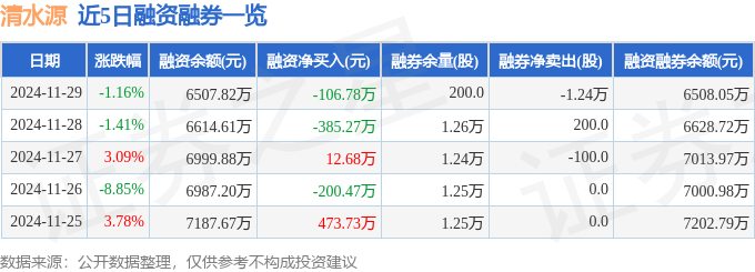清水源融资融券信息显示,融资方面,当日融资买入887.67万元,融资偿还994.46万元,融资净偿还106.78万元。融券方面,融券卖出0.0股,融券偿还1.24万股,融券余量200.0股,融券余额0.22万元。融资融券余额6508.05万元。