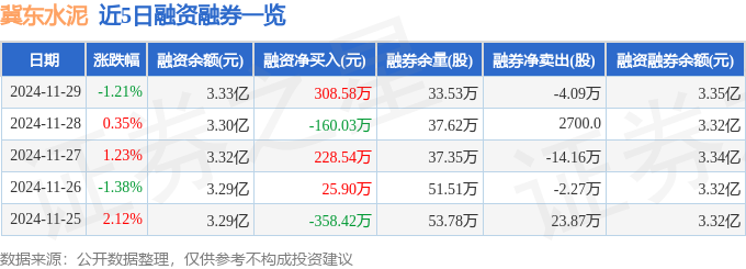 截至2024年11月29日收盘,冀东水泥(000401)报收于5.72元,下跌1.21%,换手率0.82%,成交量12.7万手,成交额7304.35万元。