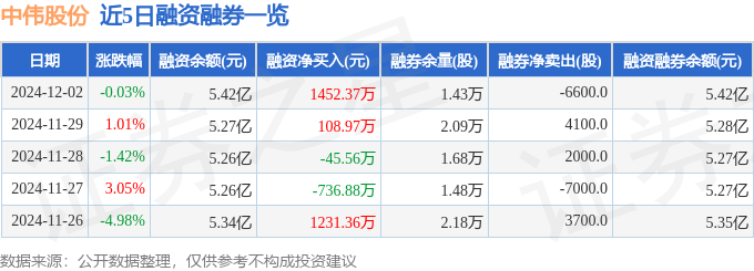 中伟股份融资融券信息显示,融资方面,当日融资买入4856.51万元,融资偿还3404.14万元,融资净买入1452.37万元。融券方面,融券卖出1000.0股,融券偿还7600.0股,融券余量1.43万股,融券余额57.16万元。融资融券余额5.42亿元。