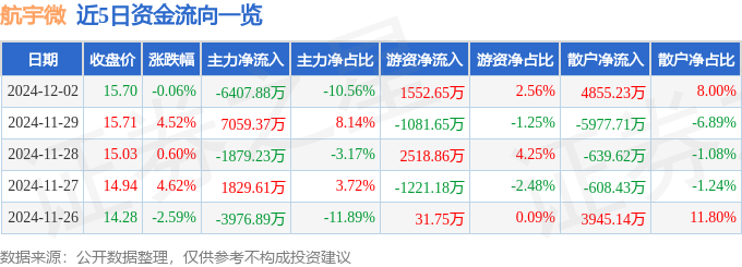 12月2日的资金流向数据方面,主力资金净流出6407.88万元,占总成交额10.56%,游资资金净流入1552.65万元,占总成交额2.56%,散户资金净流入4855.23万元,占总成交额8.0%。