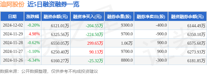 迪阿股份融资融券信息显示,融资方面,当日融资买入1058.06万元,融资偿还1262.61万元,融资净偿还204.55万元。融券方面,融券卖出1500.0股,融券偿还1900.0股,融券余量9300.0股,融券余额23.48万元。融资融券余额6144.49万元。
