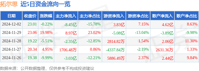 12月2日的资金流向数据方面,主力资金净流出8.45亿元,占总成交额15.78%,游资资金净流入3.83亿元,占总成交额7.15%,散户资金净流入4.62亿元,占总成交额8.63%。