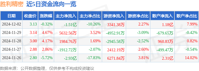 截至2024年12月2日收盘,胜利精密(002426)报收于3.13元,下跌0.32%,换手率13.73%,成交量467.07万手,成交额14.71亿元。
