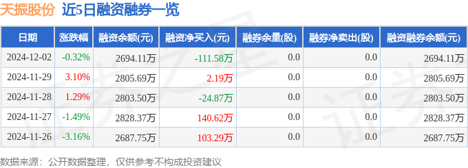 天振股份融资融券信息显示,融资方面,当日融资买入95.29万元,融资偿还206.88万元,融资净偿还111.58万元。融券方面,融券卖出0.0股,融券偿还0.0股,融券余量0.0股,融券余额0.0万元。融资融券余额2694.11万元。