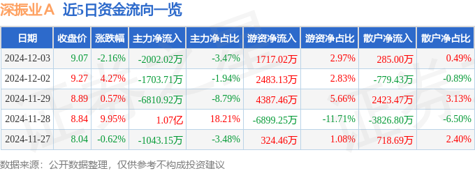 截至2024年12月3日收盘,深振业A(000006)报收于9.07元,下跌2.16%,换手率4.67%,成交量63.01万手,成交额5.78亿元。