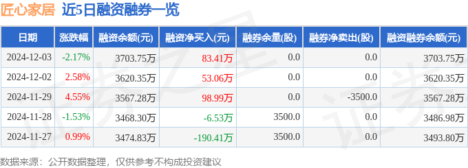 匠心家居融资融券信息显示,融资方面,当日融资买入256.38万元,融资偿还172.97万元,融资净买入83.41万元,连续3日净买入累计235.45万元。融券方面,融券卖出0.0股,融券偿还0.0股,融券余量0.0股,融券余额0.0万元。融资融券余额3703.75万元。
