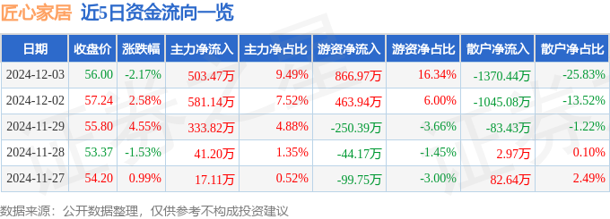 截至2024年12月3日收盘,匠心家居(301061)报收于56.0元,下跌2.17%,换手率2.23%,成交量9488.0手,成交额5306.44万元。