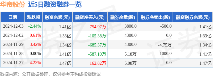 华帝股份融资融券信息显示,融资方面,当日融资买入1593.9万元,融资偿还838.93万元,融资净买入754.97万元。融券方面,融券卖出300.0股,融券偿还800.0股,融券余量3800.0股,融券余额3.04万元。融资融券余额1.41亿元。