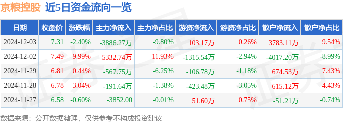 截至2024年12月3日收盘,京粮控股(000505)报收于7.31元,下跌2.4%,换手率8.52%,成交量53.87万手,成交额3.96亿元。
