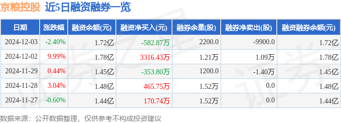 京粮控股融资融券信息显示,融资方面,当日融资买入3538.77万元,融资偿还4121.64万元,融资净偿还582.87万元。融券方面,融券卖出0.0股,融券偿还9900.0股,融券余量2200.0股,融券余额1.61万元。融资融券余额1.72亿元。