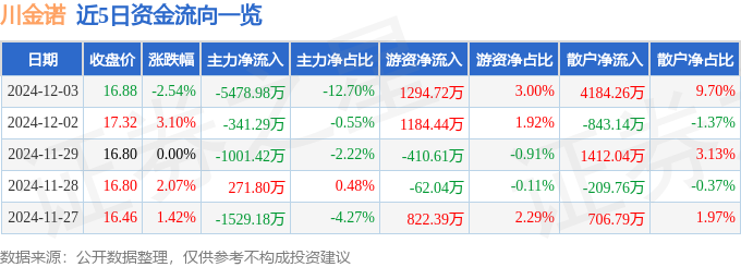 截至2024年12月3日收盘,川金诺(300505)报收于16.88元,下跌2.54%,换手率11.67%,成交量25.37万手,成交额4.31亿元。