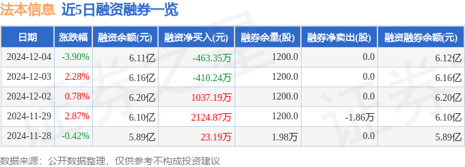 法本信息融资融券信息显示,融资方面,当日融资买入5135.1万元,融资偿还5598.45万元,融资净偿还463.35万元。融券方面,融券卖出0.0股,融券偿还0.0股,融券余量1200.0股,融券余额2.9万元。融资融券余额6.12亿元。