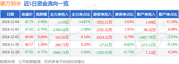 截至2024年12月4日收盘,德方纳米(300769)报收于45.79元,下跌3.9%,换手率7.68%,成交量19.33万手,成交额8.98亿元。