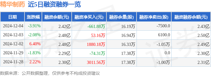 精华制药融资融券信息显示,融资方面,当日融资买入3566.92万元,融资偿还4228.8万元,融资净偿还661.88万元。融券方面,融券卖出0.0股,融券偿还7500.0股,融券余量16.19万股,融券余额139.23万元。融资融券余额2.43亿元。