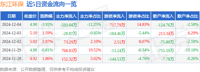 截至2024年12月4日收盘,东江环保(002672)报收于4.9元,下跌3.92%,换手率1.07%,成交量9.69万手,成交额4840.84万元。