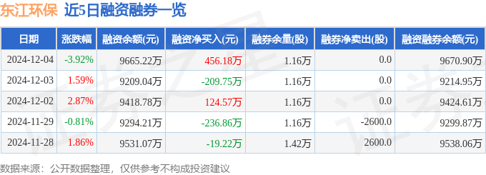 东江环保融资融券信息显示,融资方面,当日融资买入697.93万元,融资偿还241.75万元,融资净买入456.18万元。融券方面,融券卖出0.0股,融券偿还0.0股,融券余量1.16万股,融券余额5.68万元。融资融券余额9670.9万元。