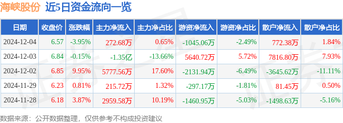 截至2024年12月4日收盘,海峡股份(002320)报收于6.57元,下跌3.95%,换手率2.84%,成交量63.19万手,成交额4.2亿元。