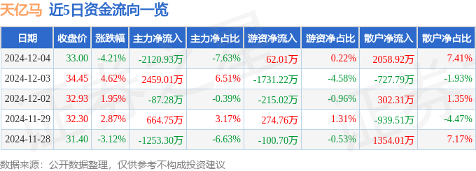 截至2024年12月4日收盘,天亿马(301178)报收于33.0元,下跌4.21%,换手率18.83%,成交量8.21万手,成交额2.78亿元。