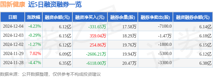 国新健康融资融券信息显示,融资方面,当日融资买入2855.23万元,融资偿还3186.87万元,融资净偿还331.65万元。融券方面,融券卖出3000.0股,融券偿还1.01万股,融券余量17.58万股,融券余额234.87万元。融资融券余额6.14亿元。
