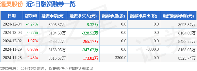 通灵股份融资融券信息显示,融资方面,当日融资买入657.41万元,融资偿还666.73万元,融资净偿还9.32万元。融券方面,融券卖出0.0股,融券偿还0.0股,融券余量0.0股,融券余额0.0万元。融资融券余额8095.37万元。