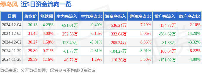 12月4日的资金流向数据方面,主力资金净流出691.01万元,占总成交额9.4%,游资资金净流入536.24万元,占总成交额7.29%,散户资金净流入154.77万元,占总成交额2.1%。