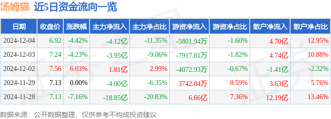 截至2024年12月4日收盘,汤姆猫(300459)报收于6.92元,下跌4.42%,换手率16.39%,成交量519.25万手,成交额36.34亿元。