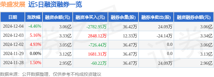 荣盛发展融资融券信息显示,融资方面,当日融资买入4293.23万元,融资偿还7076.18万元,融资净偿还2782.95万元。融券方面,融券卖出24.09万股,融券偿还0.0股,融券余量36.42万股,融券余额77.94万元。融资融券余额3.06亿元。