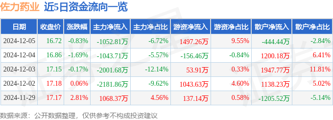 截至2024年12月5日收盘,佐力药业(300181)报收于16.72元,下跌0.83%,换手率1.56%,成交量9.38万手,成交额1.57亿元。