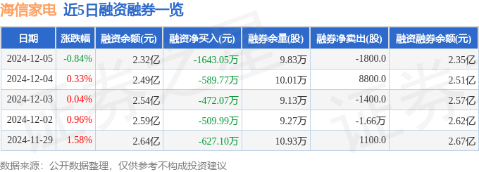 海信家电融资融券信息显示,融资方面,当日融资买入1348.46万元,融资偿还2991.51万元,融资净偿还1643.05万元。融券方面,融券卖出5300.0股,融券偿还7100.0股,融券余量9.83万股,融券余额267.08万元。融资融券余额2.35亿元。