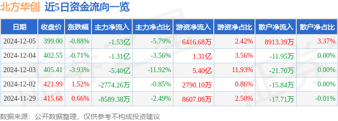 12月5日的资金流向数据方面,主力资金净流出1.53亿元,占总成交额5.79%,游资资金净流入6416.68万元,占总成交额2.42%,散户资金净流入8913.39万元,占总成交额3.37%。