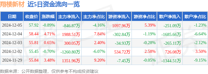 截至2024年12月5日收盘,翔楼新材(301160)报收于57.92元,下跌0.89%,换手率8.15%,成交量3.52万手,成交额2.04亿元。