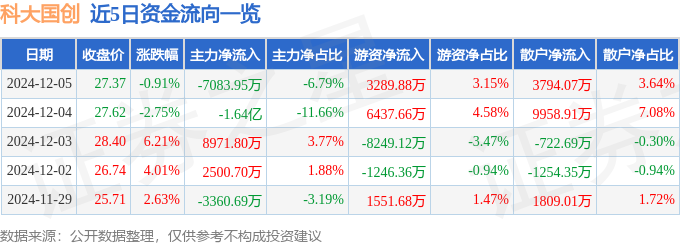 截至2024年12月5日收盘,科大国创(300520)报收于27.37元,下跌0.91%,换手率13.62%,成交量37.79万手,成交额10.43亿元。