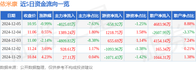截至2024年12月5日收盘,依米康(300249)报收于10.95元,下跌0.99%,换手率12.89%,成交量48.17万手,成交额5.27亿元。