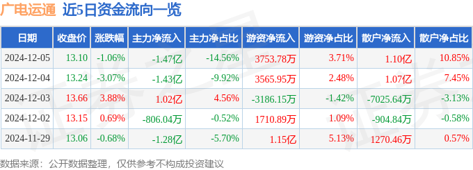 截至2024年12月5日收盘,广电运通(002152)报收于13.1元,下跌1.06%,换手率3.09%,成交量76.77万手,成交额10.13亿元。